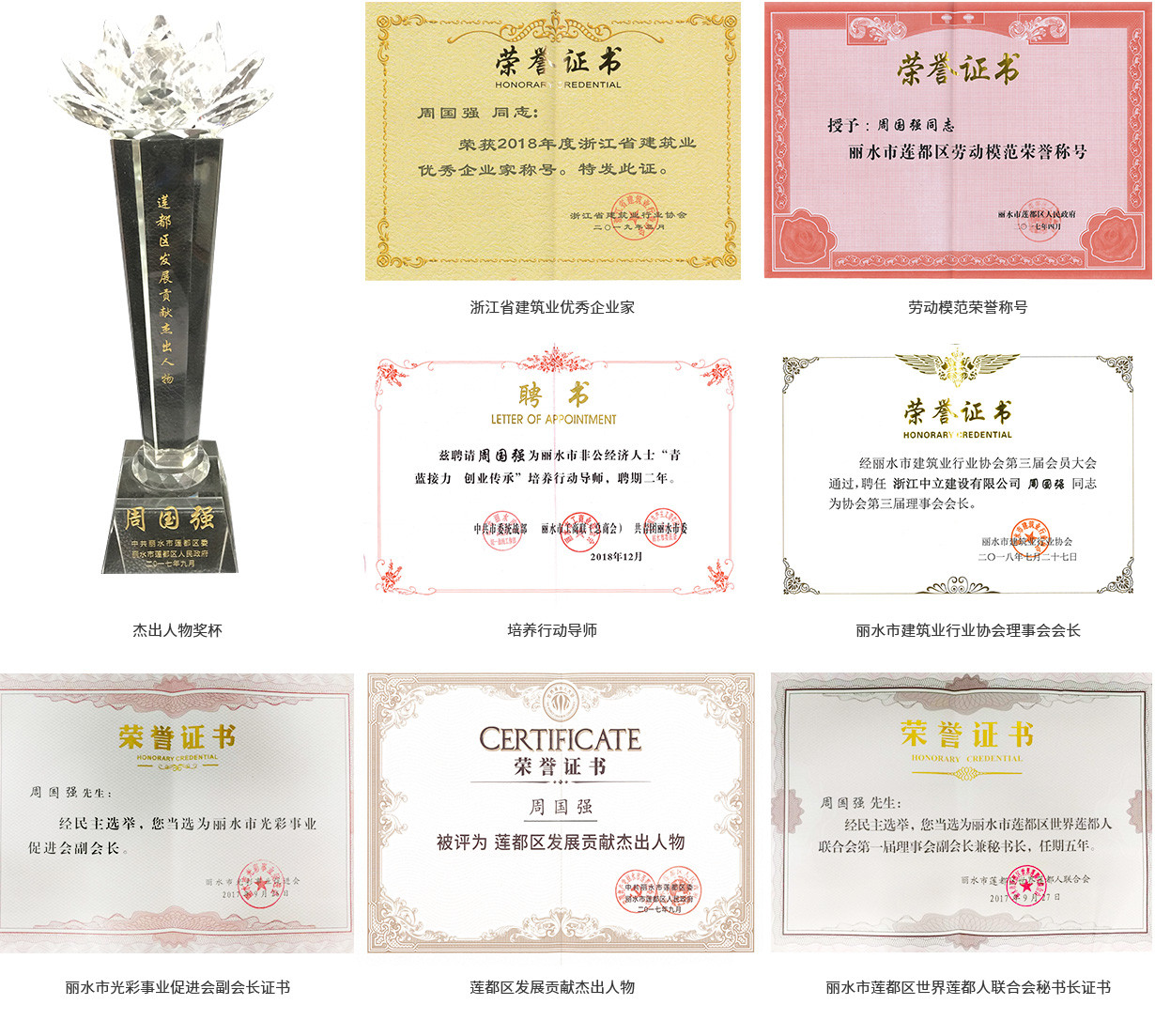 2018年7月當(dāng)選為麗水市建筑業(yè)行業(yè)協(xié)會(huì)理事會(huì)會(huì)長,2019年3月被浙江省建筑業(yè)行業(yè)協(xié)會(huì)評(píng)為2018年度浙江省建筑業(yè)優(yōu)秀企業(yè)家。
