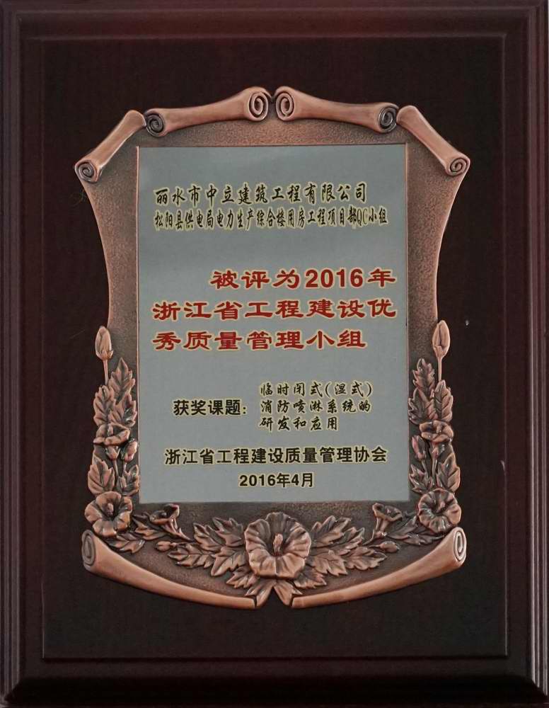 浙江省工程建設(shè)質(zhì)量管理協(xié)會(huì)于2016年4月27日至29日在杭州之江飯店舉行2016年度浙江省工程建設(shè)優(yōu)秀QC成果發(fā)布會(huì)。我公司松陽縣供電局電力生產(chǎn)綜合樓用房工程項(xiàng)目部QC小組的活動(dòng)成果“臨時(shí)閉式(濕式)消防噴淋系統(tǒng)的研發(fā)和應(yīng)用”參與交流,小組被評(píng)為2016年浙江省工程建設(shè)優(yōu)秀質(zhì)量管理小組。該成果有效地解決了高層建筑施工階段火災(zāi)控制的安全保障問題,具有施工方便、安全可靠等優(yōu)點(diǎn),且該系統(tǒng)可周轉(zhuǎn)多次重復(fù)利用,節(jié)約了工程造價(jià)成本,值得推廣到其它高層建筑施工項(xiàng)目部。