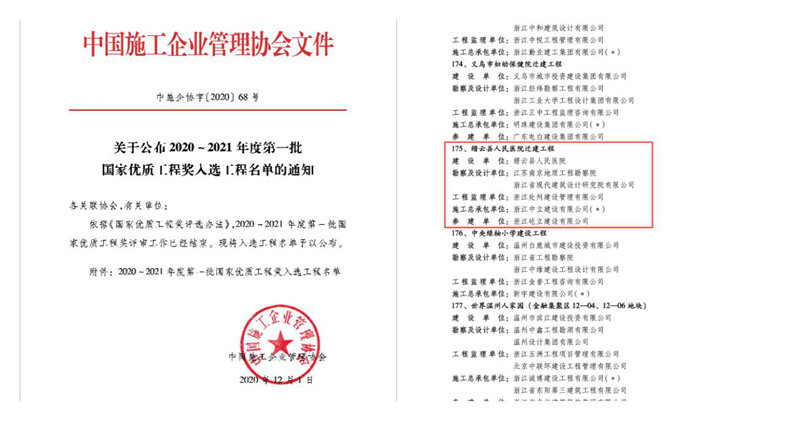 12月1日,中國施工企業(yè)管理協(xié)會公布了2020~2021年度第一批國家優(yōu)質(zhì)工程獎入選工程名單,中立建設承建的縉云縣人民醫(yī)院遷建工程榜上有名。這是公司獲得的第一個國家優(yōu)質(zhì)工程獎項目,也是麗水市本地企業(yè)第一個獲國家優(yōu)質(zhì)工程獎項目。